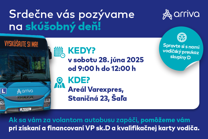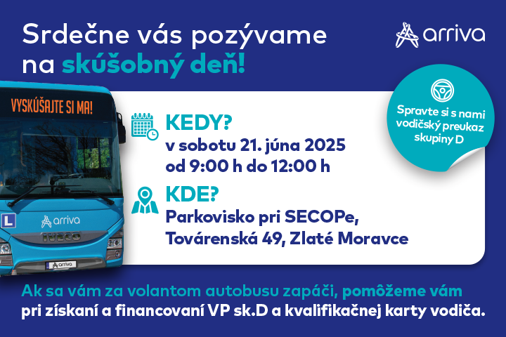 Srdečne Vás pozývame na skúšobné dni spoločnosti ARRIVA, v júni sa stretneme v Zlatých Moravciach a Šali.