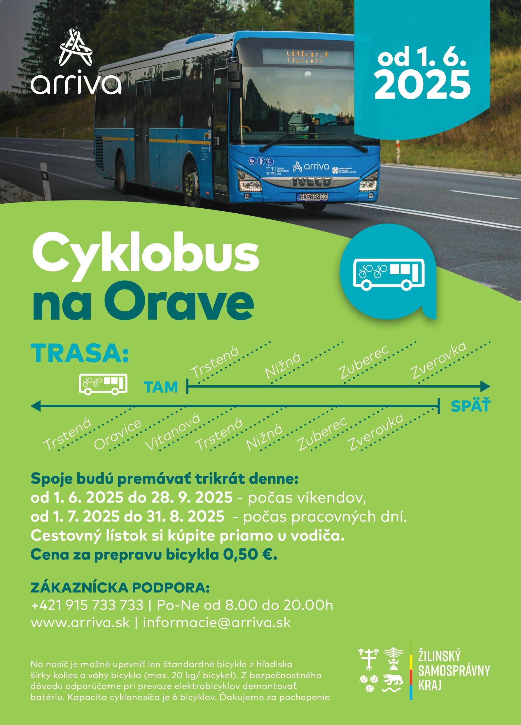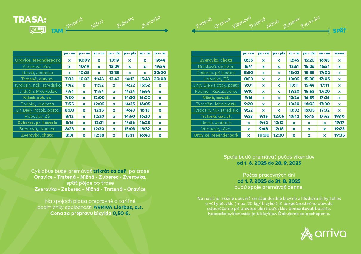 Trasa cyklobusu začína v Trstenej, ďalšou zastávkou je Nižná, Zuberec a konečná je na Zverovke. Naspäť sa bude vracať po rovnakej trase, no po zastávke v Trstenej obslúži aj zastávky vo Vitanovej a Oraviciach. Cyklobus jazdí počas letných prázdnin každý deň trikrát. Mimo prázdnin od 1. júna do 29. septembra jazdí počas víkendov. Odviezť dokáže naraz šesť bicyklov a cena za ich prevoz je 0,50 eur. Cestovné lístky si môžu cestujúci kúpiť u vodiča. Cyklobus sa riadi rovnakými tarifnými podmienkami ako všetky spoje spoločnosti ARRIVA Liorbus.