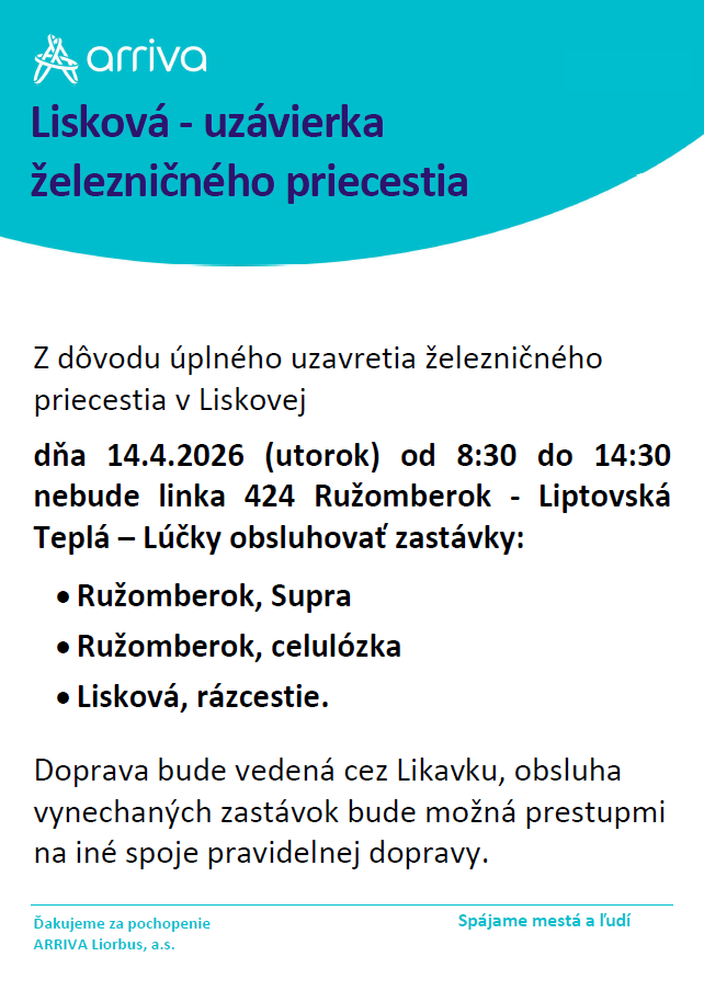 Lisková – uzávierka železničného priecestia – 14.4.2026