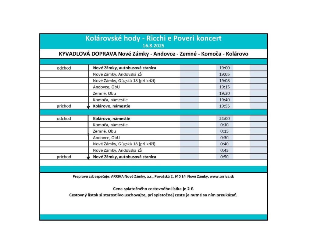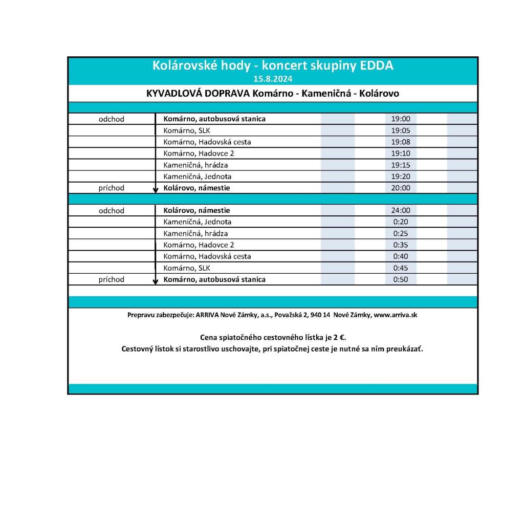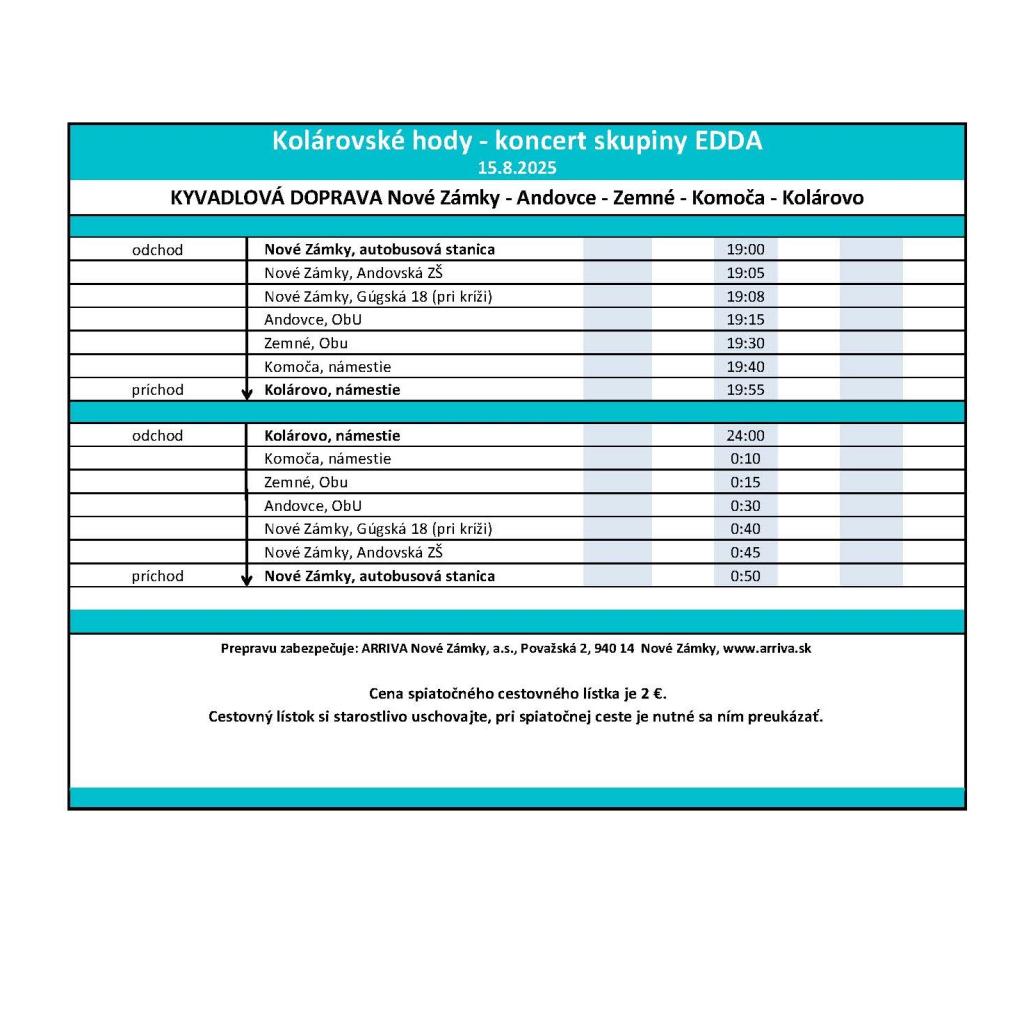 Kolárovské hody – doprava na koncerty skupiny EDDA a Ricchi e Poveri v dňoch 15.8.2025 a 16.8.2025