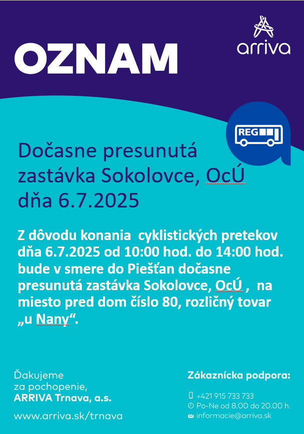 Dočasne presunutá zastávka Sokolovce OcÚ dňa 6.7.2025