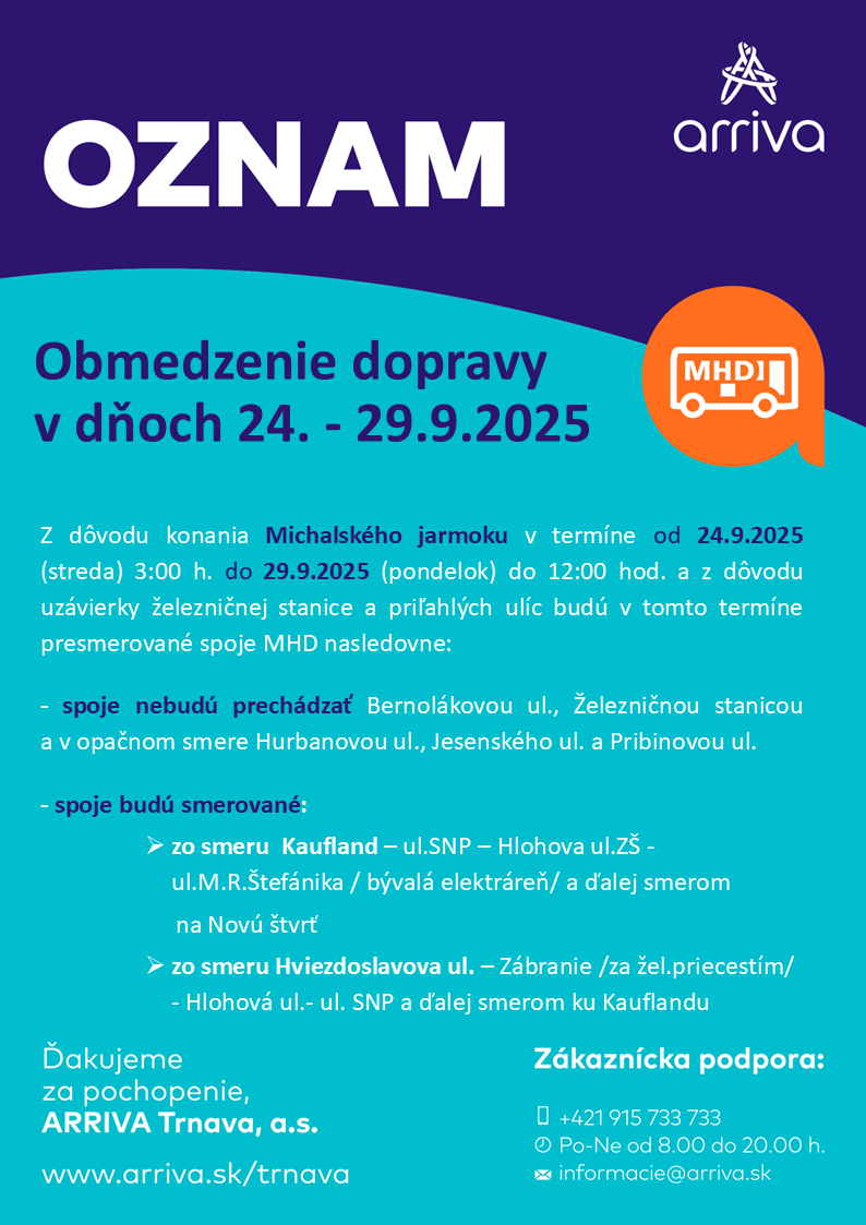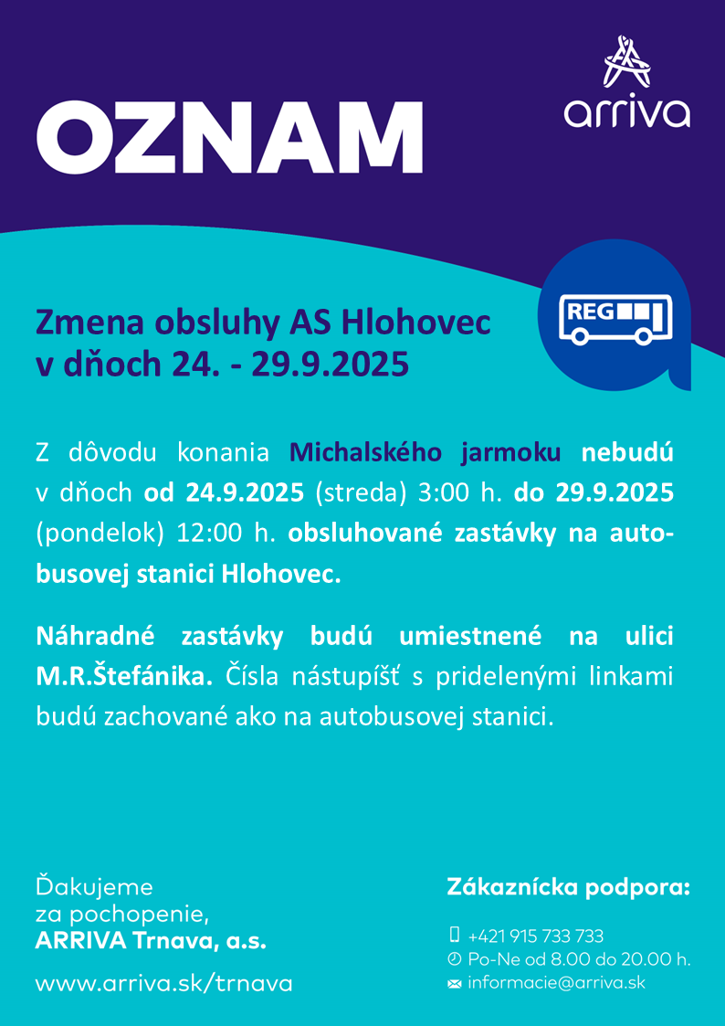 V období od 24.9.2025 (03:00 h) do 29.9.2025 (12:00 h) budú zastávky z autobusovej stanice (AS  Hlohovec) premiestnené na ul. M.R.Štefánika. Viac informácií nájdete v ozname nižšie.