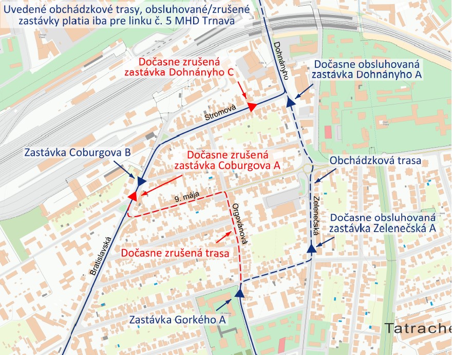 Linka č. 5 bude premávať po obchádzkovej trase pričom vynechá zastávky Coburgova A a Dohnányho C.